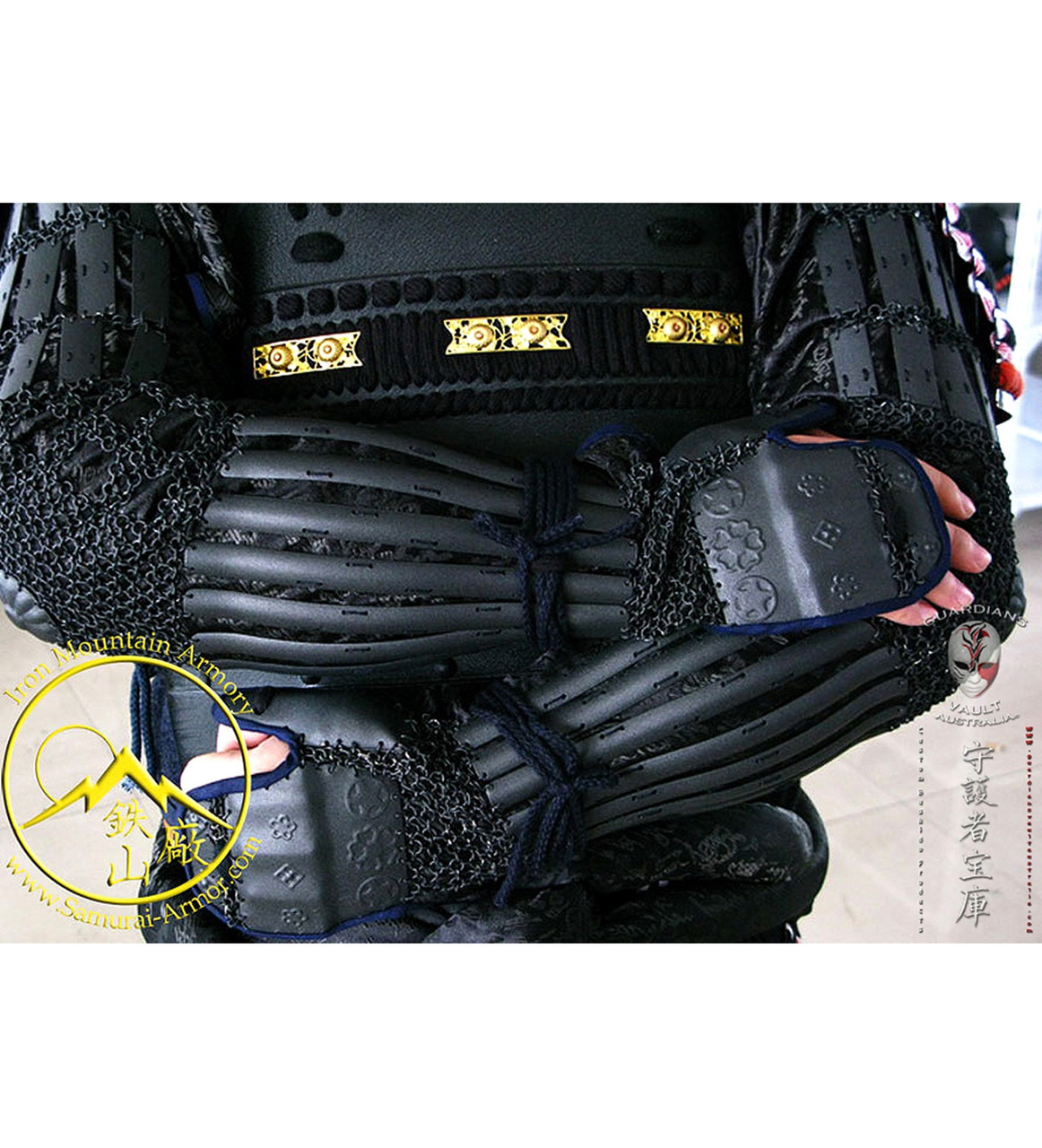 Iron Mountain Armoury kote are made up of individual iron plates, laced on and connected with kusari (chainmail) to silk brocade. The inside of the armor laces together to give the wearer a snug / comfortable fit for their unique arm size. The back of the hand is tekko (covered in small iron plates) to offer the wearer full protection with full comfort and maneuverability.