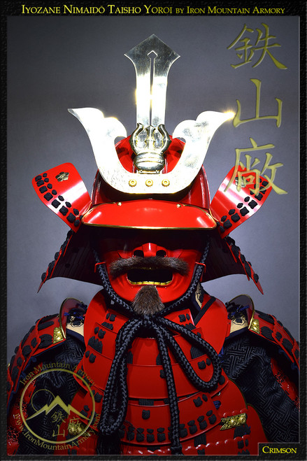 The traditional crafting of this Kiritsuke Iyo-zane Taisho class samurai armor set takes over 30 days of meticulous focus and labor, to accurately reproduce this“tosei” gusoku mimicking the classical “kozane” gusoku. An elegant tosei design like this one utilizes simulated scale plates, that are laced together to form a 2 piece chest armor. It is then bound together using a pin-hinge, known as an Okegawa dō. This style of Kiritsuke Iyo-zane yoroi was one of the most common armors used by high-ranking samurai warriors and Daimyo alike.